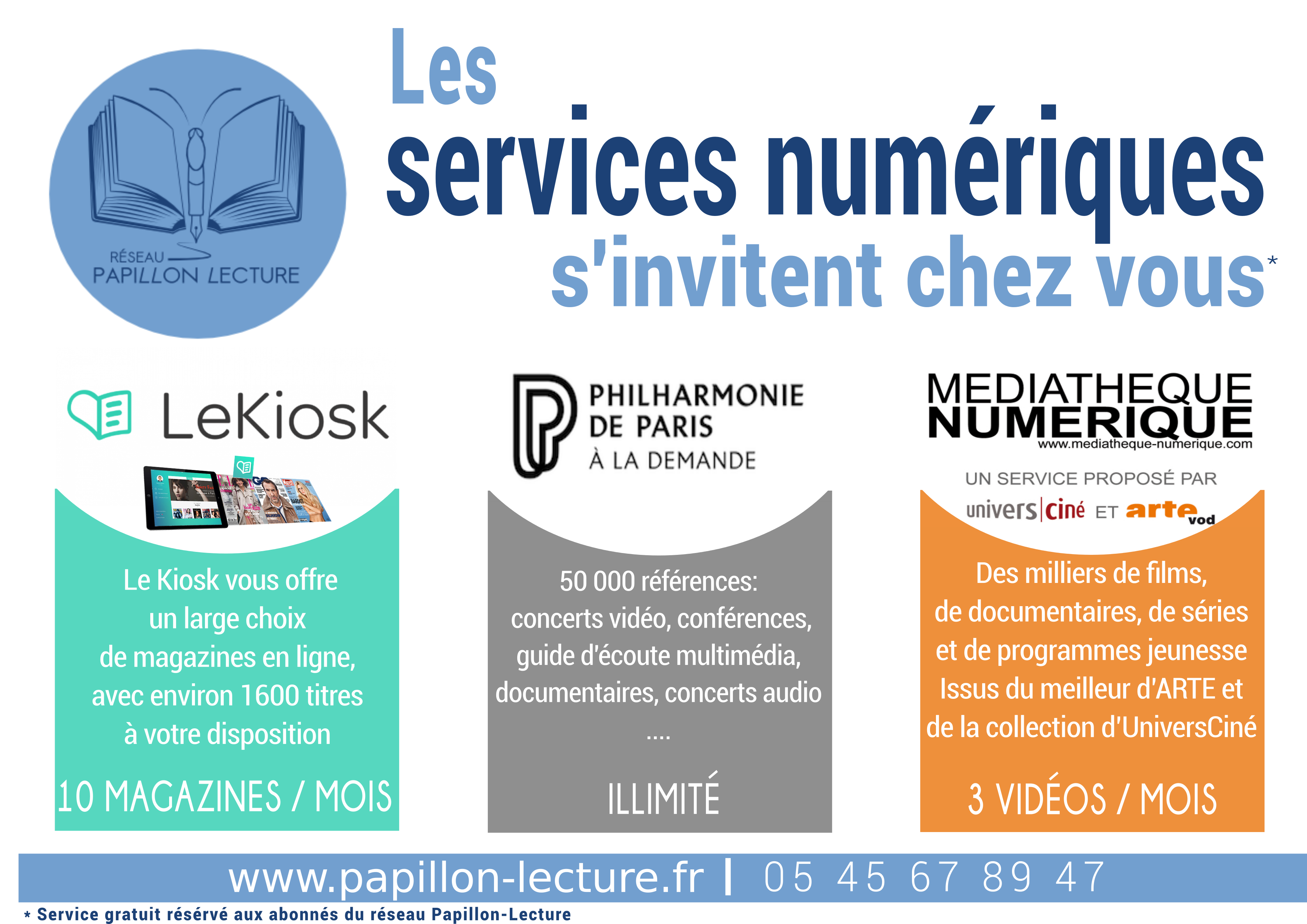 Pour clôturer cette fin d’année comme il se doit, tous nos services en ligne sont désormais accessibles soit Le Kiosk, Philarmonie de Paris et Arte VOD. Il vous suffit de vous connecter à votre espace personnel sur notre site Papillon-Lecture. Pour cela, dans la case identifiant saisissez la première lettre de votre prénom suivie de votre nom de famille en minuscule. Votre mot de passe est par défaut votre année de naissance. Nous vous invitons à modifier votre mot de passe dès votre première connexion à l’espace personnel.