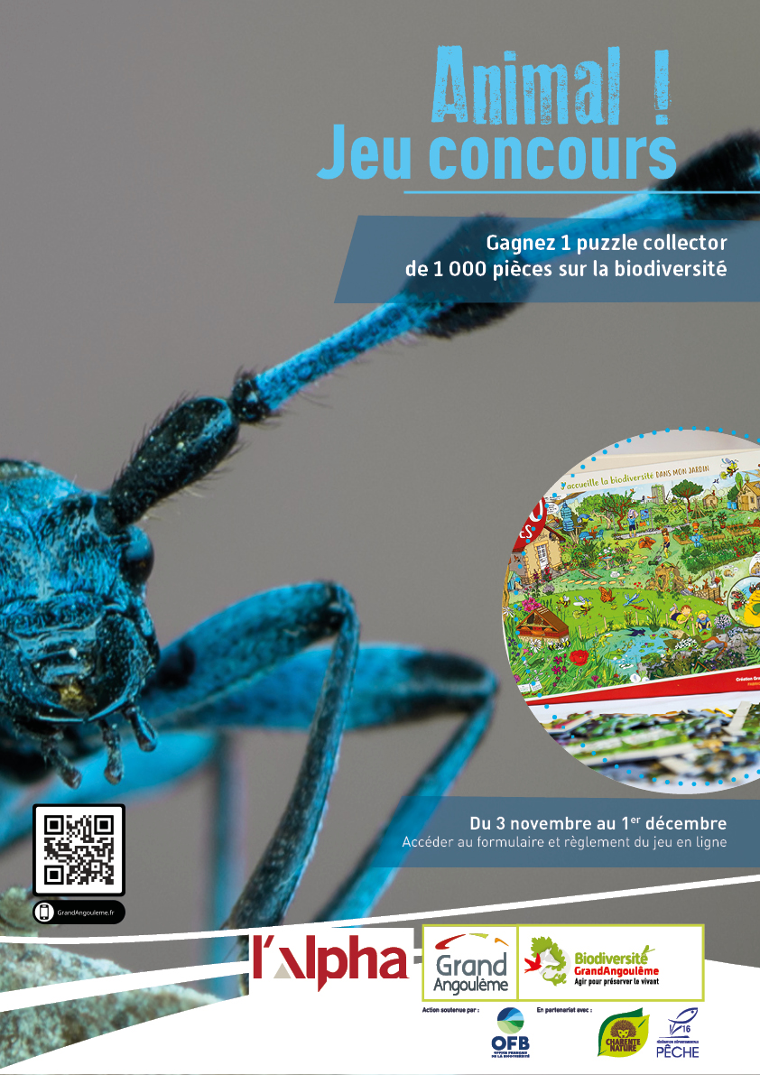 Pour valoriser l’exposition photos « Animal ! », développée dans le cadre de l’Atlas de la Biodiversité Intercommunale et située sur le parvis de la médiathèque l’Alpha (également consultable en ligne), nous lançons un jeu-concours du 3 novembre au 1er décembre, pour faire gagner un puzzle collector sur la biodiversité locale.