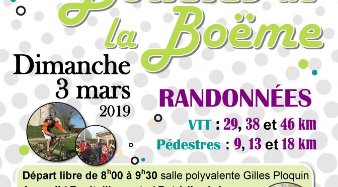 Dimanche 3 mars : Départ libre de 8h00 à 9h30 salle Gilles Ploquin : accueil – Ravitaillement – pot à l’arrivée. Tarif : – de 16 ans 2 euros – licencié 4 euros non licencié 5 euros.
