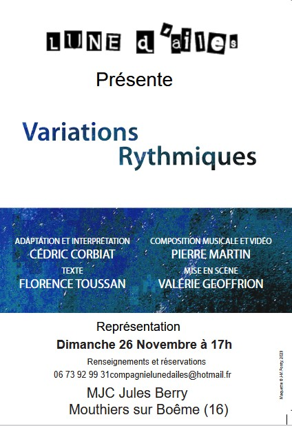 Manifestations, MJC Jules Berry mjc Jules Berry – dimanche 26 novembre 17h 14 novembre 2023 Graziella Relet Laisser un commentaire La compagnie LUNE d’ailes présente Variation rythmiques. Adaptation du texte de Florence Toussan, Cédric Corbiat interprète ce monologue. Renseignements & réservations au : 06 73 92 99 31 compagnielunedailes@hotmail.com