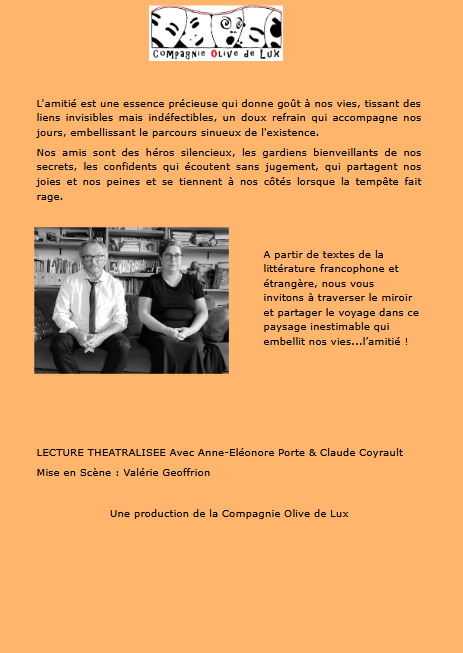 MJC Jules Berry, Spectacle LECTURE théâtralisée 8 février 2024 Michèle Lhomme Laisser un commentaire RENDEZ-VOUS SAMEDI 9 MARS à 19h30 à la MJC AMITIÉS