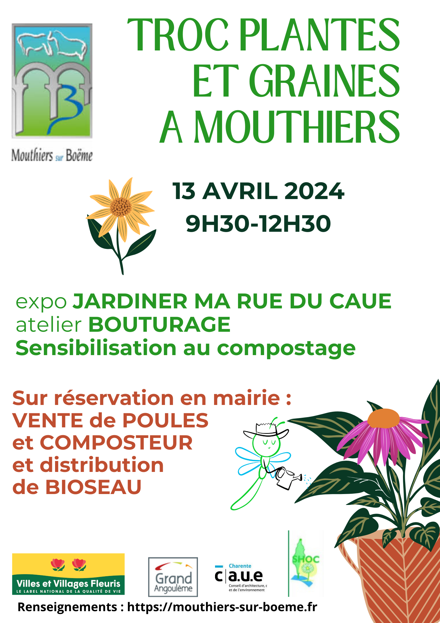 Le 13 avril de 9h30 à 12h30, le Club Nature et Jardin organise le troc plantes et graines au chevet de l’église.Le club animera un atelier bouturage et le CAUE sera présent afin de présenter son exposition « jardiner Ma rue »Des chartes de Végétalisation des pieds de mur seront également mises à disposition pour celles et ceux qui souhaiteraient planter devant chez soi.