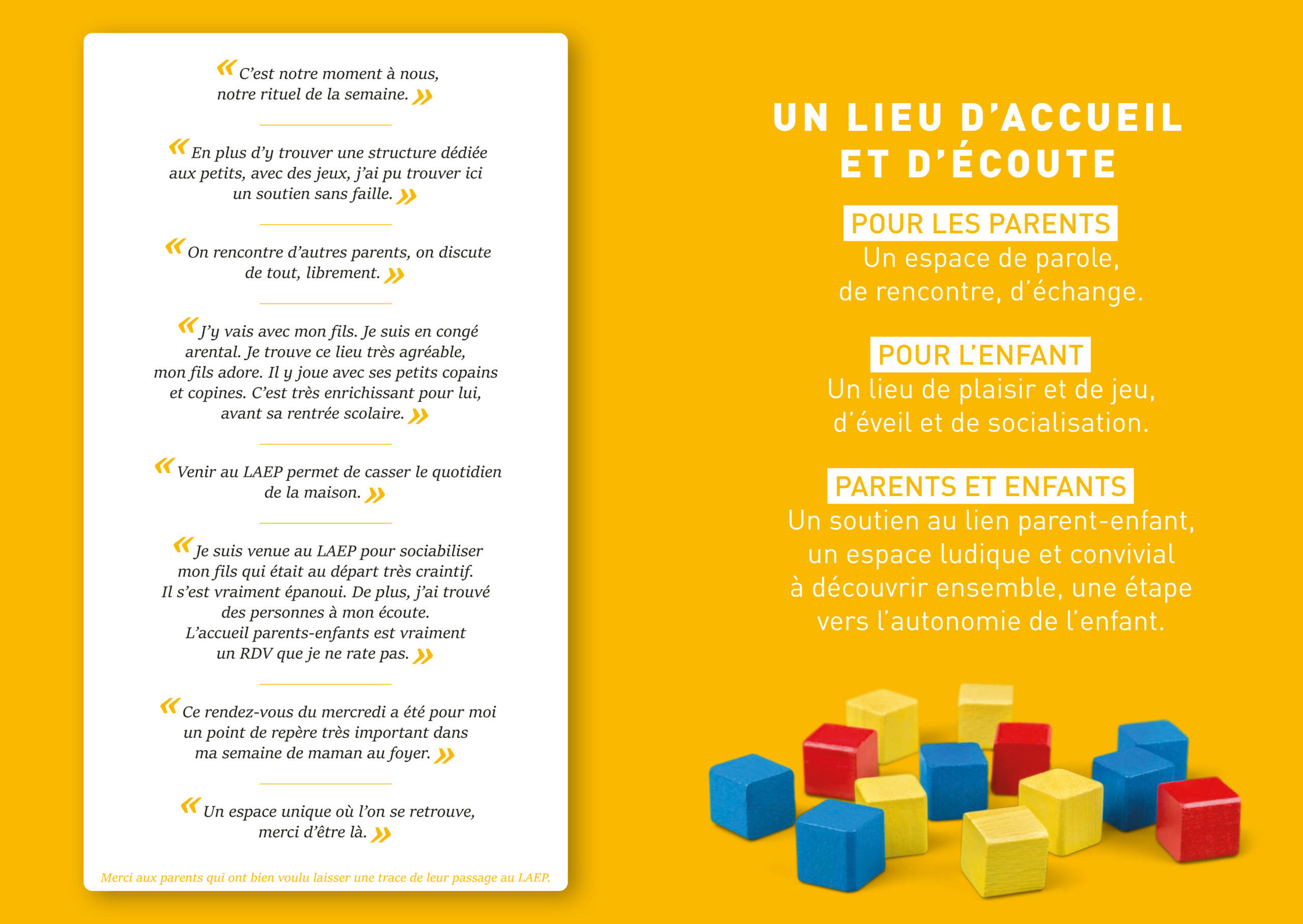 Le LAEP, Lieu d’Accueil Enfants Parents, accueille les enfants de moins de 6ans, accompagnés d’un adulte référent (parents, grands-parents, femmes enceinte, autre).