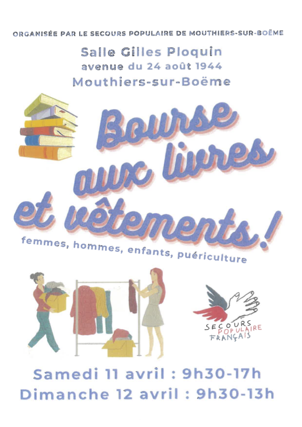 Secours populaire Bourse aux livres et aux vêtements 4 avril 2026 Murielle Lafond Les 11 et 12 Avril 2026 à la salle Gilles Ploquin