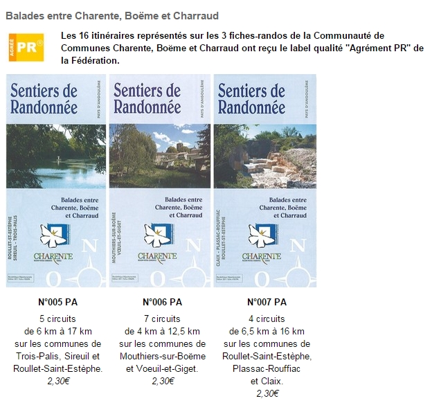 Réalisés sous la forme de 3 rando-fiches très pratiques, ces documents sont en vente . Ces rando-fiches sont disponibles à la maison du Tourisme de la Charente et dans les mairies de la Communauté de Communes au prix de 2,30 €.