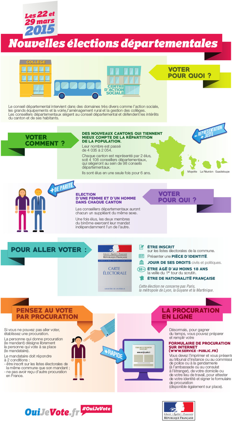 2 conseillers par canton : binôme composé d’un homme et d’une femme, élus pour 6 ans, scrutin majoritaire à deux tours. Tout bulletin raturé sera considéré comme nul.