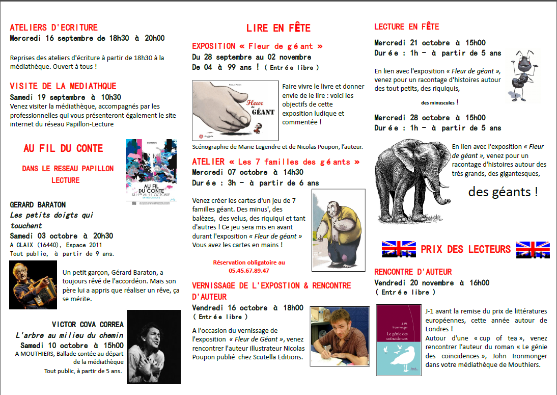 Les ateliers d’écriture ont repris leur plume et leur cahier. Au fil du comte revient dans le réseau Papillon lecture (Gérard Baraton à Claix le 03 octobre 20h30 à l’Espace 2011 – Victor Cova Correa à Mouthiers le 10 octobre à 15 heures nous proposera une ballade contée au départ de la médiathèque).