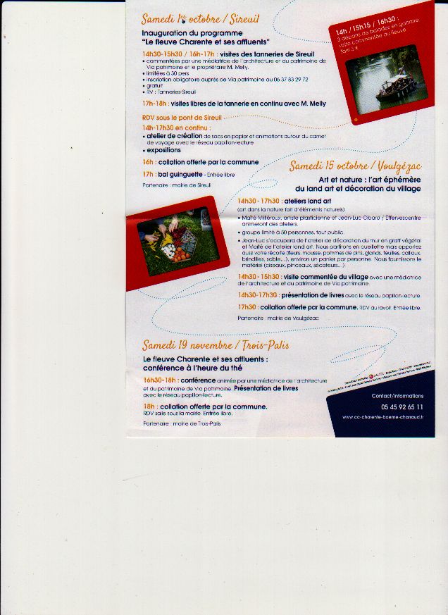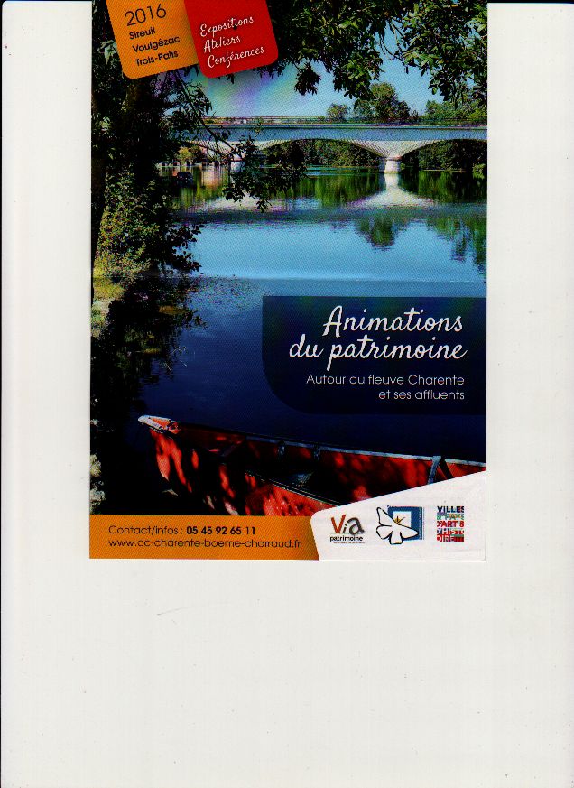A partir du samedi 1er octobre, retrouvez le cycle d’animations proposé par la Communauté de Communes Charente Boëme Charraud. Cette année le fleuve Charente et ses affluents vous conduiront en octobre à Sireuil et à Voulzéjac et en novembre à Trois-Palis.