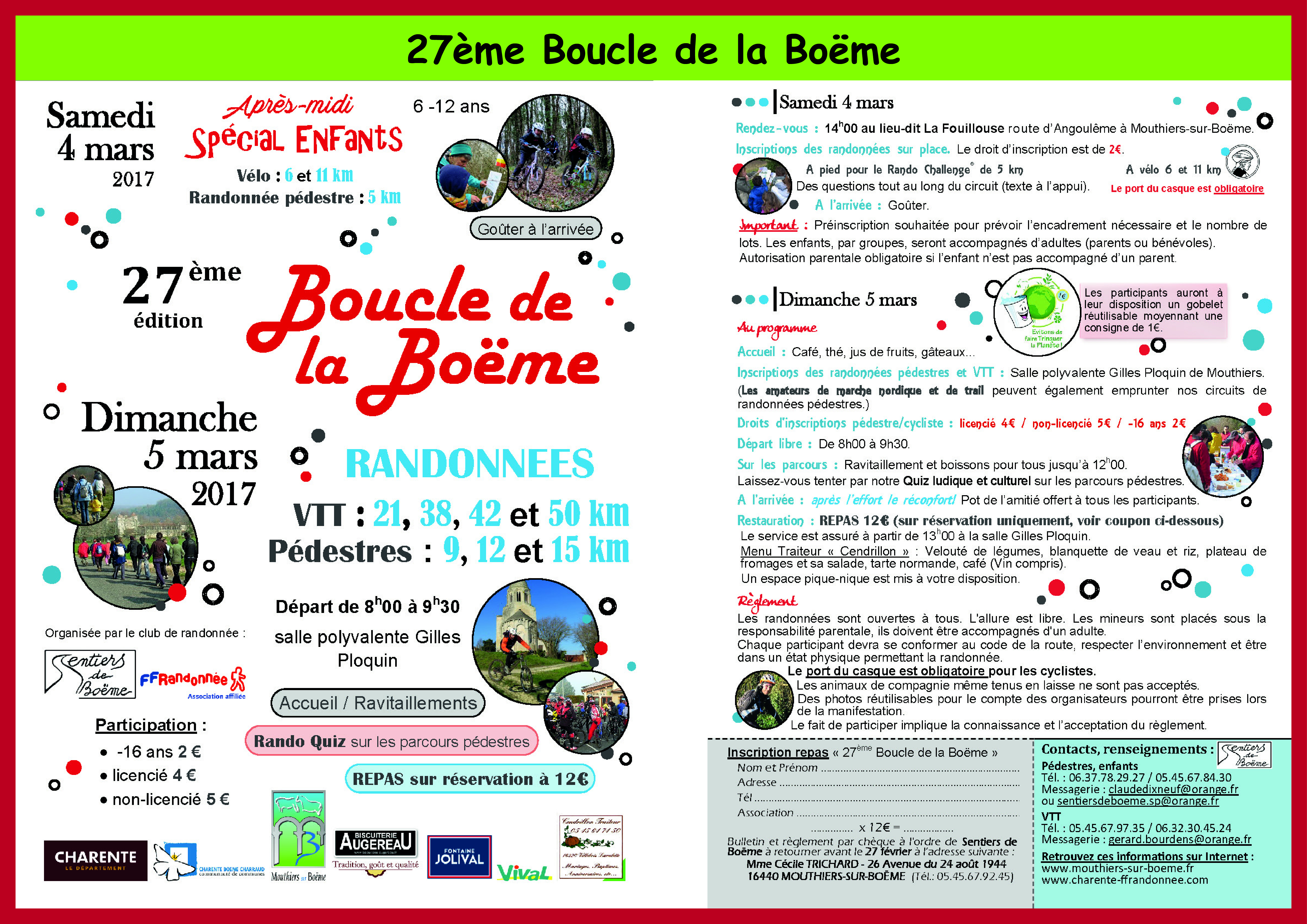 Rendez-vous salle polyvalente Gilles Ploquin. Départ de 8h00 à 9h30. Inscriptions : – de 16 ans 2 euros – licencié 4 euros – non licencié 5 euros. Sur les parcours ravitaillement et boissons pour tous jusqu’à 12 heures. Les participants auront à leur disposition un gobelet réutilisable, consigne 1 euro.  A l’arrivée apéritif offert aux participants. Enfin pour ceux qui souhaite se restaurer sur place, il vous est proposé un repas à 12 euros (sur réservation uniquement – coupon dans le journal communal). Un espace pique-nique est aussi mis à disposition.