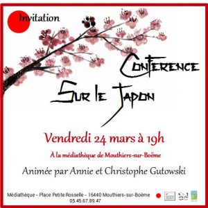 Bibliothèque - Médiathèque Médiathèque de Mouthiers sur Boëme – Rappel 16 mars 2017 Graziella Relet Laisser un commentaire En mars, la médiathèque vous propose : Conférence sur le Japon : vendredi 24 mars à 19 heures Exposition Bogolan : du 17 mars au 07 avril