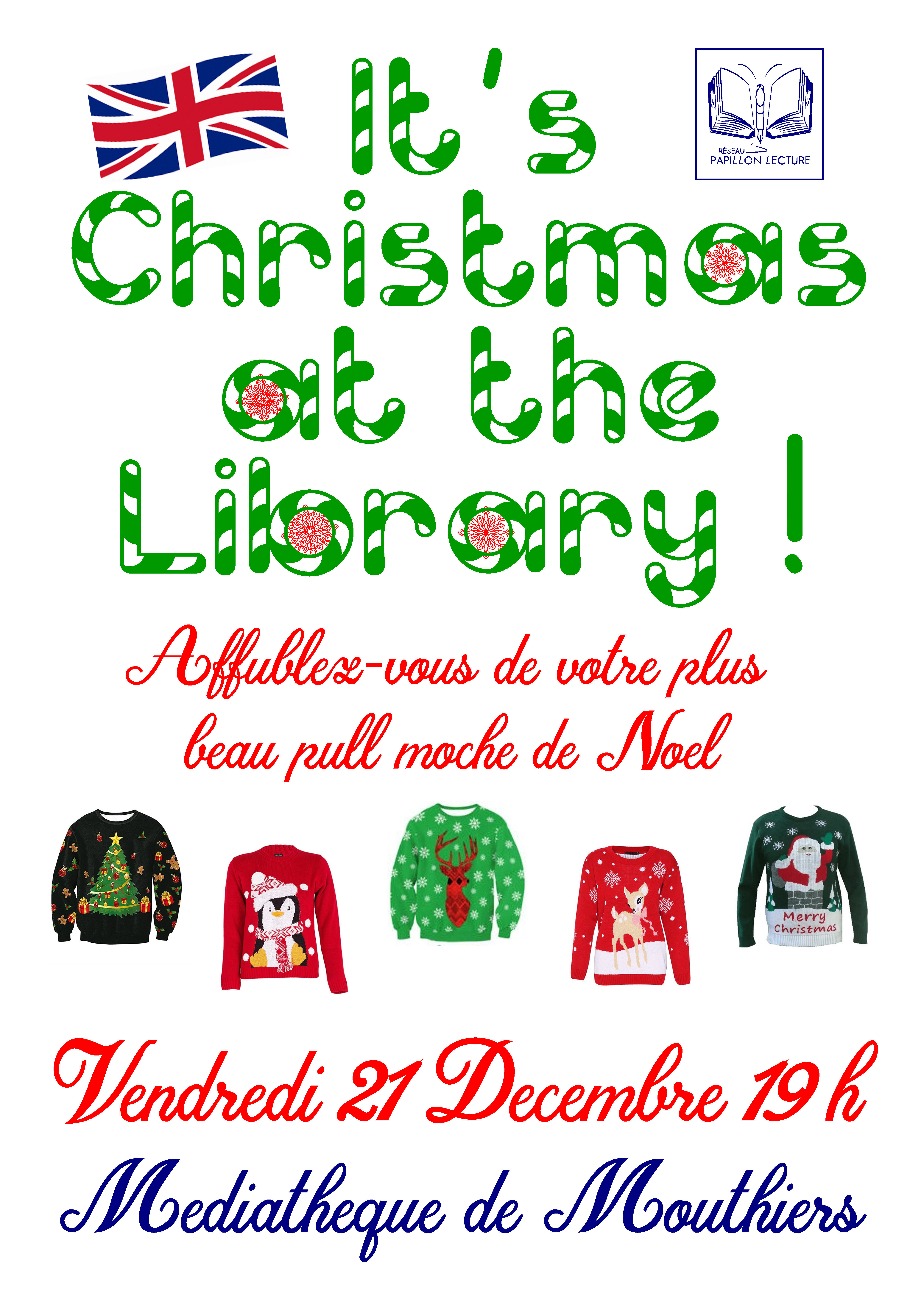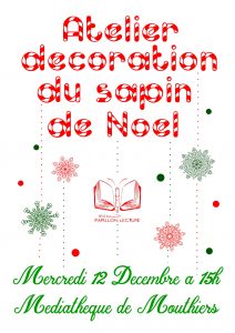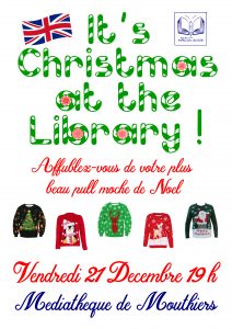 Bibliothèque - Médiathèque Décembre à la médiathèque 6 décembre 2018 Graziella Relet Laisser un commentaire Rendez-vous mercredi 12 décembre à partir de 15 heures pour l’atelier décoration de sapin de Nöel. Rendez-vous vendredi 21 décembre à 19 heures. Venez afflublez de votre plus beau pull de Noël. Vous allez faire des ravages…