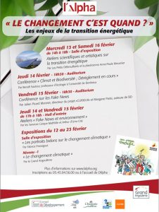 - Jeudi 14 février: Forum scolaires autour du changement climatique et des énergies renouvelables et à 18h30 Conférence de Benoit Sautour, professeur d’écologie à l’université de Bordeaux et ambassadeur de la fête de la science pour la région Nouvelle Aquitaine, sur le thème « Climat et biodiversité : dérèglements en cours! ». Tous publics.