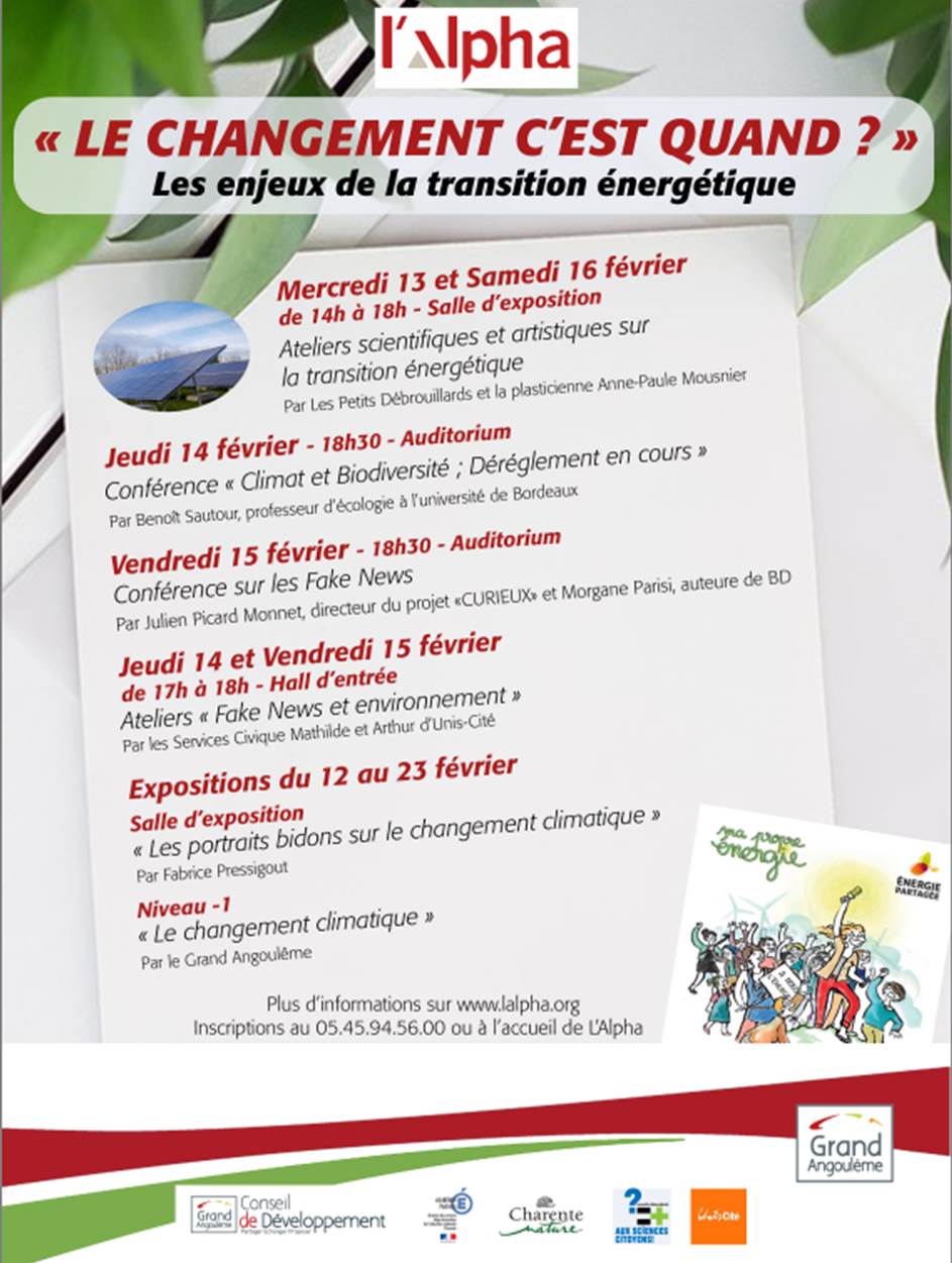 - « Porteurs de parole » avec le Conseil de développement de GrandAngoulême : Recueil de la parole du public sur le changement climatique « Le changement c’est quand ? Comment ? Avec qui ? Et moi dans tout ça ? » dans le hall de l’Alpha (famille et grand public mercredi 13 de 14h à 17h ; vendredi 15 de 18h à 18h30 et de 20h à 20h30 ; samedi 16 de 14h à 16h30).