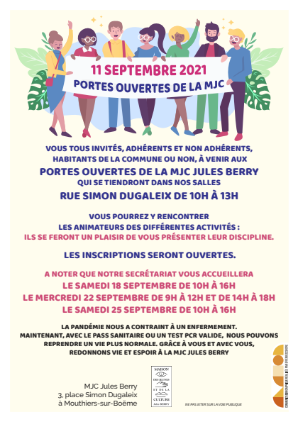 MJC Jules Berry 11 septembre 2021 31 août 2021 Michèle Lhomme Laisser un commentaire Journée Portes Ouvertes à la MJC le 11 septembre de 10h à 13H La MJC sera ouverte pour les inscriptions le samedi suivant.