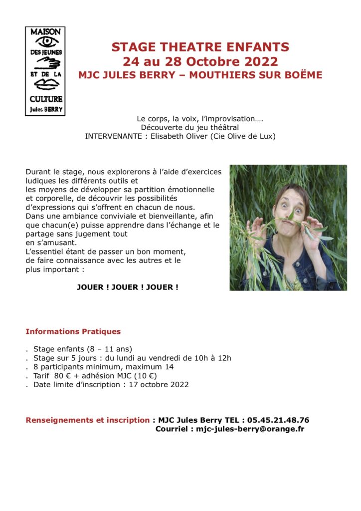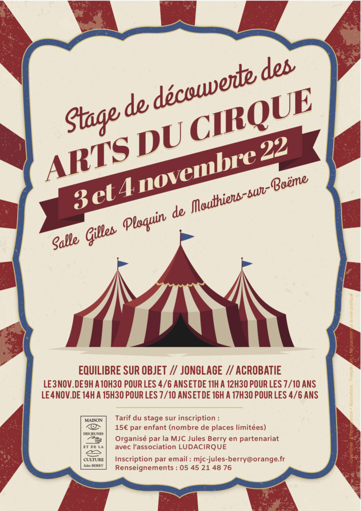 MJC Jules Berry Stage théâtre enfants du 24 au 28 octobre stage cirque enfants 3 et 4 novembre 29 septembre 2022 Michèle Lhomme Laisser un commentaire En partenariat avec l’association LUDACIRQUE, la MJC Jules Berry vous propose de venir vous initier aux arts du cirque les 3 ou 4 novembre.